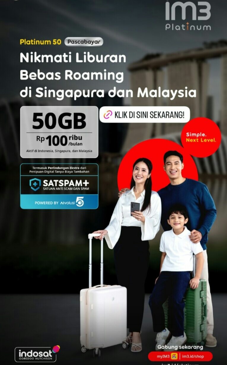Makassar,14 November 2025,redaksimedia.com-Indosat Ooredoo Hutchison melalui brand IM3 kembali menghadirkan inovasi bagi pelanggan yang gemar bepergian ke luar negeri. Dalam poster resmi yang dirilis, IM3 memperkenalkan Platinum 50, paket pascabayar terbaru yang menawarkan 50GB hanya Rp100 ribu per bulan, lengkap dengan fitur bebas roaming di Singapura dan Malaysia.