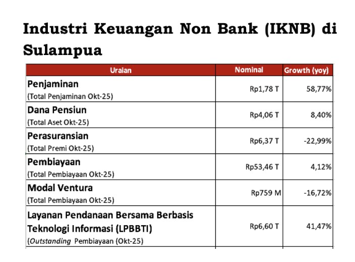Makassar,15 Januari 2026,redaksimedia.com-Kinerja IKNB di wilayah Sulampua menunjukkan perkembangan yang bervariasi. Kepala Otoritas Jasa Keuangan Sulselbar Moh.Muchlasin Mengatakan Total Penjaminan tercatat tumbuh signifikan sebesar 58,77 persen, sementara total aset Dana Pensiun tumbuh sebesar 8,40 persen. Di sisi lain, total premi perusahaan asuransi mengalami penurunan sebesar -22,99 persen.