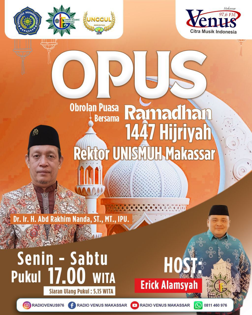 Makassar,17 Februari 2026,redaksimedia.com-Bulan Suci Ramadhan 1447 Segera kita jalankan, Radio Venus 97,6 Fm Kembali Hadir dengan Program Specialnya Obrolan Puasa Ramadhan atau Opus Ramadhan dan juga kembali Menghadirkan Narasumber Utama Rektor Unismuh Makassar, Dr Ir H. Abd Rakhim Nanda Yang juga merupakan Sekretaris Pimpinan Wilayah Muhammadiyah Sulsel dan Opus Ramadhan kami Hadir setiap Hari Senin sampai Sabtu di jam 5 sore dan juga akan kami Siarkan ulangnya di subuh Hari jam 5.15 Subuh